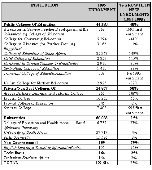 Approximately 130 000 students (nearly one third of South Africa’s teachers) were enrolled in teacher education at a distance in 1995. Moreover, the sector is expanding rapidly, experiencing a 23% increase in new enrolments between 1994 and 1995. Most of this expansion has been concentrated in two providers: the College of Education of South Africa (with a 149% increase in new enrolments) and Success College (which registered 7403 students in its first year). During the same period, half the providers actually experienced a decline in the growth of new enrolments (two Pietermaritzburg-based colleges, Natal College of Education and Access College, registered over 100% increases in new enrolment, but from low bases). A number of institutions blamed the decline in their numbers on the expansion of low cost courses with high chances of success in some institutions.