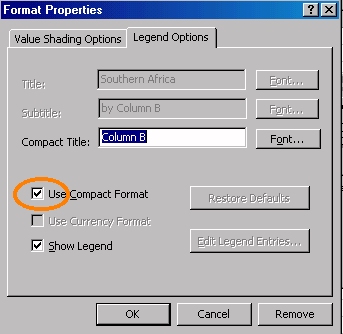 To edit a map legend Click Map, Value Shading Options, Legend Options, then Use Compact Format. The legend will become more meaningful with graduated numbers and shades.