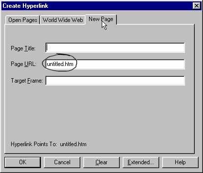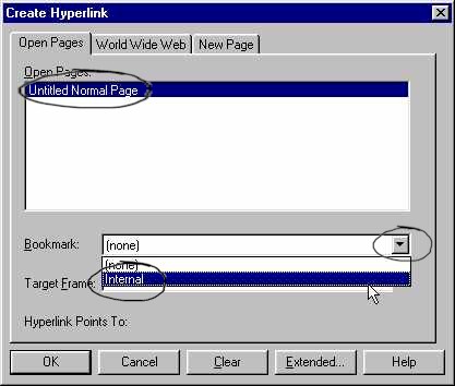 Highlight a word in the bookmark / target. Click on Edit Click on Bookmark Type in the name of the Bookmark (in the example above the name is Internal). Click on OK. Now go to the text from which you want to link. This text is known as the Anchor. Highlight the text. Click on the Create or Edit Hyperlink icon in the toolbar (see below) Click on the name of the current file (it may just be shown as Untitled Normal Page or FrontPage Express) - see below. Select the name of the bookmark from the pull-down list next to Bookmark. Click on OK. |