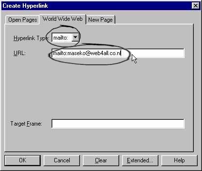 First type in the text that you want to make clickable in your Web document. Highlight the text. Click on the Create or Edit Hyperlink icon in the toolbar (see below) Then click on the New Page Tab and type in the full file name (including the .htm) that you wish to link to. Click on OK First type in the text that you want to make clickable in your Web document. Highlight the text. Click on the Create or Edit Hyperlink icon in the toolbar (see below) Select the Hyperlink Type http: (see below) Type in the full Web site address of the Web site to which you are linking (see the example above which is http://www.uct.ac.za). First type in the text that you want to make clickable in your Web document, for example, contact us. Highlight the text. Click on the Create or Edit Hyperlink icon in the toolbar (see below) Select the Hyperlink Type mailto: (see below) Type in the full e-mail address to which you want to link (see above, where the example shows maseko@web4all.co.nl) Click on OK An internal link is a clickable link to a different place in the same Web page. Firstly go to the place in the document that is the intended destination of the link. The destination is known as the bookmark or target. You have to decide on a name for the bookmark/ target.