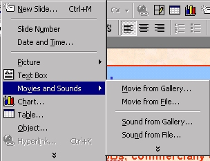 Under Check to animate slide objects, select the check box next to the text or object you want to animate. In the illustrated example the text will be animated, and will Fly in From left. Repeat for every object you want to animate. To change the order of animation: Click the Order & Timing tab. Under Animation order select the object you want to change, and then click one of the arrows to move the object up or down in the list. To view the animation: Click Slide Show, then Click on View Show To insert a video (movie) to a slideDisplay the slide you want to add the video to. Click on the Insert menu Click on Movies and Sounds. Do one of the following:
