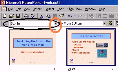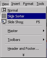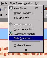 basic assistance in PowerPoint. PowerPoint Help has assistance in advanced detail. Movement can be added to a PowerPoint presentation with transitions to add a special effect to introduce a slide. For example, you can fade in from black or dissolve from one slide to another. You can choose the transitions you want, and you can vary the speed of each. Do not add a transition to the first slide as it should be visible before the presentation begins, to focus the audience on the forthcoming presentation. To insert a transition to a slideOn the menu bar click View, then Click on Slide Sorter. Select the slide or slides you want to add a transition to. To select more than one slide, press the Ctrl button on the keyboard while clicking on the slides with the mouse. In the illustrated example the transition is between Slide 1 and Slide 2 in the