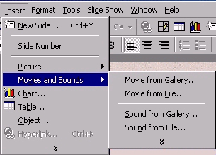 To insert music or sound on a slideDisplay the slide you want to add music or sound to. On the Insert menu, point to Movies and Sounds.