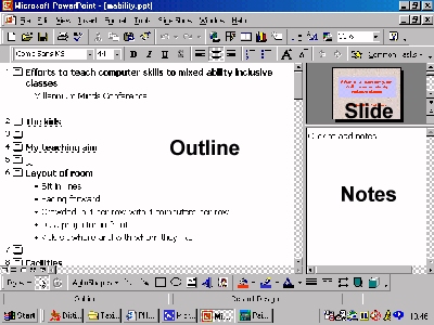 | Normal View contains three panes: the outline pane, the slide pane, and