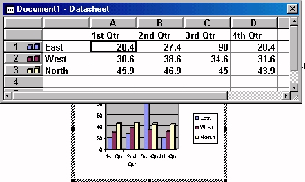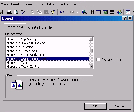or Click Insert on the menu bar. Click Object, then Create New, then Microsoft Graph 2000 Chart.