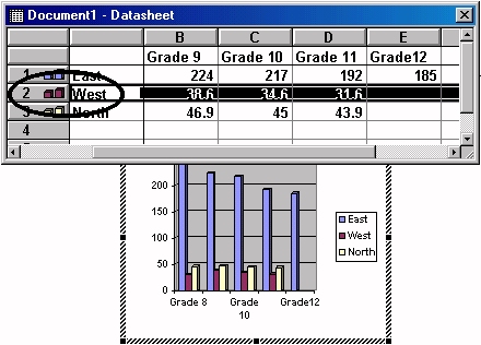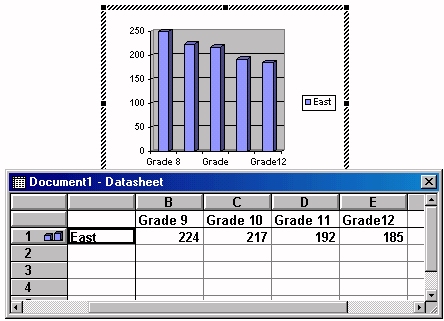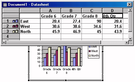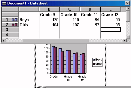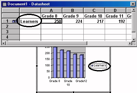 In this example we will create a graph showing the learners in the different grades in the school. In the first row below the headings A - D, enter the names of the grades. Watch what happens to the graph as you enter data into the datasheet.