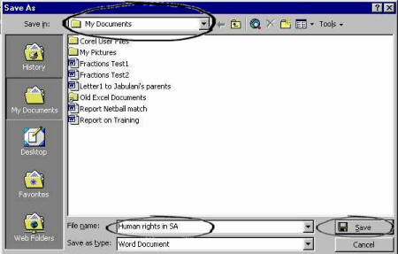 The first thing to do is to ensure that you are saving the file in the correct folder. Look at what is written in the Save in: line at the top of the pop-up screen. Type your chosen file name in the File name: box at the bottom of the screen. Then click on the Save button. You use Save the first time you