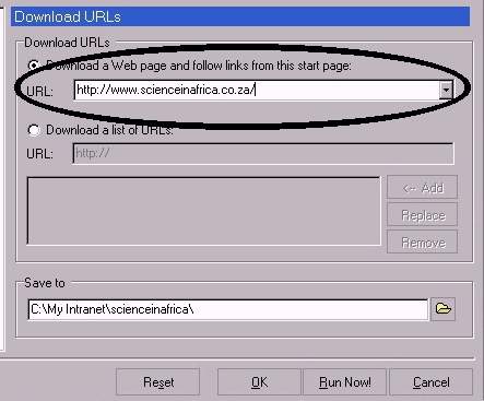 In the pop-up screen, in the box provided (circled below), type or paste the address (URL) of the web site you wish to download.